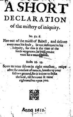 In 1609, while still there, Smyth wrote a tract titled "The Character of the Beast". In it he expressed two propositions: first, infants are not to be baptized; and second, unbelievers are to be admitted into the true Church by baptism."[11] Hence, his conviction was that a scriptural church should consist only of regenerate believers who had been baptized confessing faith and past sins. They rejected the doctrine of infant baptism.[21][22]