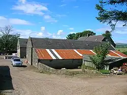 The ancient mansion or castle[3] of Kersland stood on Easter (now 'East') Kersland Farm. The remains of the 'L-Plan' tower has been built into the farmhouse. The barmkin wall survives and has a surviving strong defensive corner tower.[4] Paterson records that the house was almost entirely pulled down by the feuar, Robert Ker.[5] The remaining two barrel vaulted chambers, later used as a dairy and stable, with walls 8 ft thick, until recently formed part of the offices attached to East Kersland.