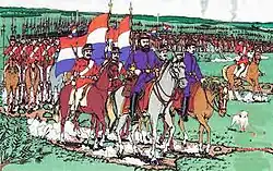 Battle of São Borja (July 10, 1865): 1st battalion of Brazilian volunteers defending their flag against the Paraguayans (according to a sketch by M. Mynssen).