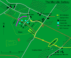 On 7 June, Nos. 4 and 5 Troops of 3 Commando under command of Major John Pooley MC, carried out an attack on Merville battery, whose guns had been repaired and were again firing toward and several miles short of the landing beaches.[22] Since the first assault the battery had been reoccupied and it was now heavily defended by mortars and landmines. Approaching from Le Plein to the south, No. 4 Troop moved across the open ground before taking up position behind the hedgerows 300 yards from the battery and from there laid down covering fire for No. 5 Troop which approached from the east with fixed bayonets.[23]