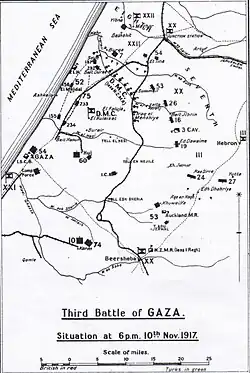 After the capture of Beersheba on 31 October, from 1 to 7 November, strong Ottoman rearguard units at Tel el Khuweilfe in the southern Judean Hills, at Hareira and Sheria on the maritime plain, and at Gaza close to the Mediterranean coast, held the Egyptian Expeditionary Force in heavy fighting. During this time the Ottoman Army was able to withdraw in good order; the rearguard garrisons retiring under cover of darkness during the night of 8/9 November 1917.[2]