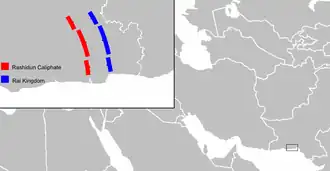 Further east from the Indus River laid Sindh, which was the domain of the Rai Kingdom.[5] Umar, after learning that Sindh was a poor and relatively barren land, disapproved Suhail's proposal to cross the Indus River.[6] For the time being, Umar declared the Indus River, a natural barrier, to be the easternmost frontier of his domain. This campaign came to an end in mid-644.[7]
