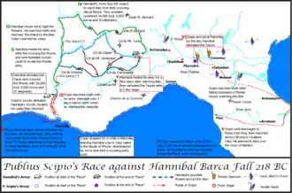Hannibal had anticipated Rome's intentions, and may have planned to defeat Scipio in Spain or Gaul before invading Italy, thus securing Carthage's Spanish possessions and forestalling the planned Roman invasion of Africa.[33] Probably starting in late May or early June, the Carthaginian army spent almost three months moving from Cartagena to the Pyrenees, including a 43-day campaign conquering Catalonia. [34] Hannibal was denied his planned confrontation with Scipio, whose journey to Spain was delayed by the Gallic revolt.[34][35]