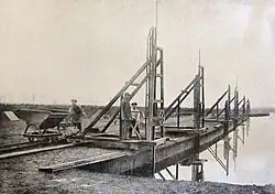 A track gauge of 600 mm was uniformly chosen for the transport tracks. They were made of 65 to 110 millimetres (2.6 to 4.3 in), mostly 90 millimetres (3.5 in), high loose rails of 10 to 18 kilograms (22 to 40 lb) weight per metre laid on wooden sleepers. The most frequented lines were underlaid with a ballast bed of mine gravel or slag. Their total length was about 13 kilometres (8.1 mi). The rolling stock consisted of four light railway locomotives, 104 tipping lorries of 750 litres (160 imp gal; 200 US gal) capacity and 16 platform wagons. In the transport tracks there were 39 points for the transportable tracks, partly on wooden sleepers, partly on steel sleepers. There were also a large number of turntables and climbing turntables. The latter were used in particular to connect the transportable tracks with the permanent tracks.[15][16]