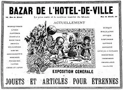 By 1870, Bazar Napoléon occupied all of the stores building on Rue de Rivoli. After the fall of the Second French Empire the store was renamed to "Bazar de l'Hôtel de Ville" referencing Hôtel de Ville across the street.[3][5]