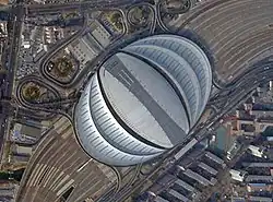 The enormous oval-shaped station was designed by the British architecture firm of TFP Farrells in collaboration with the Tianjin Design Institute.[5] It was built from more than 60,000 tons of steel and 490,000 cubic metres (17,304,000 cu ft) of concrete by 4,000 workers in less than three years. The glass ceiling is outfitted with 3,246 solar panels to generate electricity. The structure spreads out like a ray or trilobite and covers 320,000 square metres (3,444,000 sq ft), more than the Beijing National Stadium's 258,000 square metres (2,777,000 sq ft).[2] Its 24 platforms have the capacity to dispatch 30,000 passengers per hour or almost 241 million a year.[6] The 251,000-square-metre (2,702,000 sq ft) waiting area can accommodate 10,000 passengers.