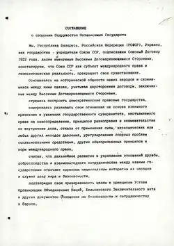 1. ^ Russian: Беловежские соглашения, romanizedBelovezhskiye soglasheniya; Belarusian: Белавежскае пагадненне, romanizedBielaviežskaje pahadniennie; Ukrainian: Біловезькі угоди, romanizedBilovezʹki uhody.