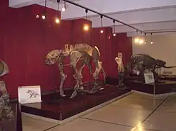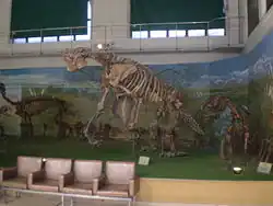 Besides the Natural Sciences Institute, the museum houses thirteen permanent exhibition halls, including an aquarium, a display with specimens collected from Argentina's numerous research stations in Antarctica, a geological collection centered on meteorites found in Argentina, a paleontology section notable for its Carnotaurus, Eoraptor, Herrerasaurus and Patagosaurus fossils, among others, and a Cenozoic paleontology display featuring Glyptodon, Macrauchenia, Megatherium and Smilodon fossils. Academics and the general public can also avail themselves of a science auditorium, an art gallery, library and a café.