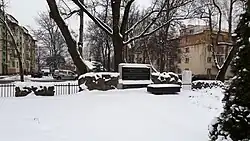 The exhumation lasted from February 25 to April 5, 1971. All the remains of the corpses were placed in wooden coffins and buried in a mass grave located at this cemetery in accordance with the development project and a park was created in its place, with a monument dedicated to the heroes of the ghetto uprising in August 1943 located in it. It was founded by the city's Jewish community around 1946 and has the form of an obelisk with a Star of David. During the liquidation of the cemetery, it was hidden and put back in its place after 1989. In the part adjacent to Proletariacka Street there is a mausoleum with a plaque from 1971 commemorating the interment of the ashes of approximately 3,500 Jews murdered by the Nazis in exterminist actions and killed during the ghetto uprising.[7] In 2023 the remanents of the former wall surrounding the cemetery was restored and declared monument of heritage.[8]