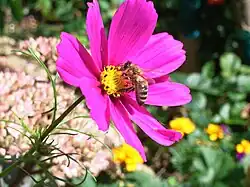 The flowers of Cosmos bipinnatus attract birds and butterflies,[26] including the monarch butterfly. It can be part of butterfly gardening and pollinator/honey-bee habitat gardens.[26]