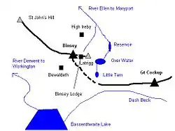Binsey sends out a further spur to the east, culminating in the shapely top of Latrigg (1,030 ft)— not to be confused with Latrigg near Keswick. Beneath Latrigg is Over Water, a large tarn which was raised by damming in 1920 to provide drinking water for Wigton.[1] The outflow of Over Water feeds the Ellen, as does the gloriously named Humble Jumble Gill which drains Binsey's northern flank.