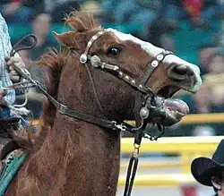- Gag bit: A bit that, depending on design, may outwardly resemble a snaffle or a curb, but with added slots or rings that provide leverage by sliding the bit up in the horse's mouth, a very severe design.