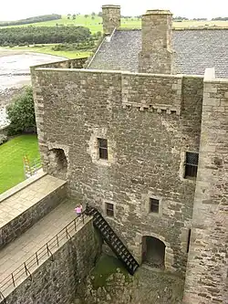 Between 1534 and 1540, a programme of fortification was carried out under the direction of the King's Master of Works, Sir James Hamilton of Finnart.[9] Finnart, the illegitimate son of the Earl of Arran, was an expert in artillery fortification. Having spent time in Europe studying the subject, he designed his own castle at Craignethan in Lanarkshire as a showcase for his ideas.[10] At Blackness, he introduced technological innovations including a complex entrance with a caponier, one of only three surviving in Scotland (the others being at Craignethan and Stirling Castle). The caponier, a passage within the external wall of the entrance, allowed defenders to fire into the entrance area, at the backs of any attackers who had breached the gate. The curtain wall was thickened on the inside to the south and east, from 1.5 m (5 ft) to over 5 m (16 ft) in places, and gun ports were opened up. The south wall was also heightened to enclose the new south tower.[11]