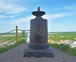 A monument dedicated to the discoverer of the deposit, Stepan Chumpin, was built on the summit of Blagodat mountain in 1826. In the 20th century the monument was moved to a new location at the edge of the quarry. The monument is a cast iron pillar surmounted with a metal bowl containing metal tongues of flame. The inscription on the monument reads: "Vogul Stepan Chumpin was burnt here in 1730". This fact of the Vogul burning is disputed by historians.[7][6]