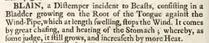 According to Ephraim Chambers' 18th-century Cyclopaedia, or an Universal Dictionary of Arts and Sciences, blain was "a distemper" (in the archaic eighteenth-century sense of the word, meaning "disease") occurring in animals, consisting of a "Bladder growing on the Root of the Tongue against the Wind-Pipe", which "at length swelling, stops the Wind". It was thought to occur "by great chafing, and heating of the Stomach".