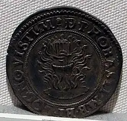 Coin of Francesco II Gonzaga showing the heraldic badge of a Melting Pot, circumscribed by the Latin motto DOMINE PROBASTI ET COGNOVISTI ME ("O Lord thou hast searched me and known me") (Psalm 139:1)[1]