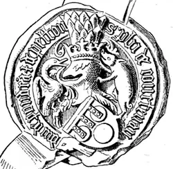 Counter seal of Humphrey de Bohun, 4th Earl of Hereford (1276–1322), attached to the Barons' Letter, 1301, showing the Bohun swan above the escutcheon and supporting the guige strap