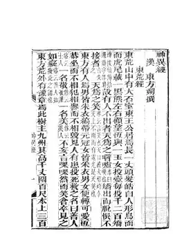 Book of Gods and Strange Things or Shenyi Jing (Chinese: 神異經) is an ancient Chinese geography book. The original version was written by Dongfang Shuo during the Han dynasty.[1] The modern versions were edited by Zhang Hua during the Jin dynasty and Zhu Mouhan during the Ming dynasty.