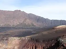 ![]() Bordeira and its summit Pico de Caldeira seen from the foot of Pico do Fogo in 2012, before the most recent eruption | |