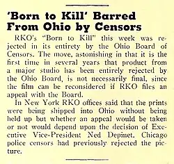 - ^ "Ohio's Censors Reject RKO's 'Born to Kill'", The Film Daily (New York, N.Y.), April 19, 1947, p. 4. Internet Archive. Retrieved September 14, 2020.