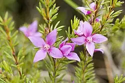 Boronia falcifolia is a shrub which grows to a height of 0.3–1 m (1–3 ft) with a few glabrous, angled stems. It has simple or trifoliate leaves 3–25 mm (0.12–0.98 in) long and about 1 mm (0.039 in) wide, with a petiole 3–15 mm (0.12–0.59 in) long. The leaflets are more or less circular in cross section, usually curved and the end leaflet is similar in size and shape to the side leaflets. Up to three bright pink flowers about 10 mm (0.4 in) in diameter are arranged in the upper leaf axils, each flower on a pedicel 2–9 mm (0.08–0.4 in) long. The four sepals are narrow triangular about 4 mm (0.2 in) long and 1 mm (0.04 in) wide and the four petals are 4–8 mm (0.2–0.3 in) long with a small point on their end. The eight stamens are slightly hairy. Flowering occurs mainly from August to October and the fruit are glabrous, 2.5–4 mm (0.098–0.16 in) long and about 2 mm (0.079 in) wide.[2][3][4]