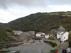 Boscastle (Cornish: Kastelboterel)[1] is a village and fishing port on the north coast of Cornwall, England, in the civil parish of Forrabury and Minster (where the 2011 Census population was included) . It is 14 miles (23 km) south of Bude and 5 miles (8 km) northeast of Tintagel.[2] The harbour is a natural inlet protected by two stone harbour walls built in 1584 by Sir Richard Grenville and is the only significant harbour for 20 miles (32 km) along the coast. The village extends up the valleys of the River Valency and River Jordan. Heavy rainfall on 16 August 2004 caused extensive damage to the village.