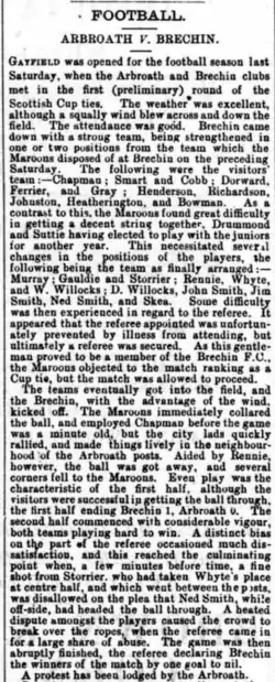 From the 1891–92 season the Scottish FA introduced qualifying rounds, and the club lost each of its first ties until its final entry in 1895–96.[15] The club however was unlucky in 1891–92. Drawn to play at Arbroath in the first qualifying round, the clubs played an already-arranged friendly in August, with the Red Lichties winng 7–3.[16] The media therefore thought that, as regards the Cup tie, "the result cannot be doubtful",[17] but Arbroath was forced to make changes, and Brechin came away with a surprise 1–0 win. However Arbroath had protested before the match that the official referee had not turned up due to illness, and the replacement (Mr Dalgetty) being a Brechin club member meant the match could not count as a Cup tie; the referee's decisions "occasioned much dissatisfaction" and, after he controversially disallowed a late equalizer for offside, the crowd broke onto the pitch, causing the abandonment of the match and the referee to declare the result as it stood.[18]