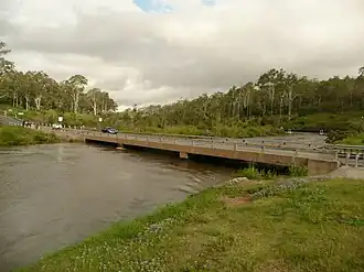 When Lake Wivenhoe is full the waters extend many kilometres up the river.[23] The first crossing upstream from the lake is a high level bridge built in conjunction with the dam to raise the Esk Kilcoy Road well above the maximum level of the lake. Several minor crossings of this section of the river shown on maps are omitted from the list below. The omitted crossings belong to one of the following groups: