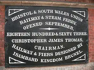 A "Bristol and South Wales Junction Railway" was authorised by an act of Parliament, the Bristol and South Wales Junction Railway Act 1846 (9 & 10 Vict. c. cv). Isambard Kingdom Brunel surveyed a route across the Severn and the ferry at New Passage was purchased, but the line failed to raise enough money so was not built. The "Bristol, South Wales and Southampton Union Railway" proposed in 1854 to carry a line through the centre of Bristol and along the Avon Gorge to New Passage, where a train ferry would cross the water. This became the "Bristol and South Wales Union Railway" (B&SWUR). The Bristol and South Wales Union Act 1857 (20 & 21 Vict. c. 54) was passed on 27 July 1857 authorising a route to the east and north of Bristol. Brunel died in 1859 and the works were completed by Robert Pearson Brereton.[1]