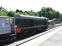 D8000 was delivered in June 1957 in overall green livery, with grey footplate,[6] red bufferbeams and a grey roof extending down the bodyside to the edge of the roof panels.[15] The original batch of 10 locos bore the BR crest facing towards the nose on both sides, used yellow sans serif numerals, and had green cab roofs; locos from D8010 had the correct pattern BR crest, white numerals and grey cab roof. This was adjusted after D8103[6] to include a small yellow warning panel, although the precise size and detail of such panels varied somewhat.[4]