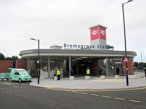 Bromsgrove railway station serves the town of Bromsgrove in Worcestershire, England. It is located at the foot of the two-mile Lickey Incline which ascends at a gradient of 1-in-37.7 towards Barnt Green on the line between Birmingham and Worcester. Bromsgrove is managed by West Midlands Railway. The current station opened on 12 July 2016, replacing an older station located slightly to the north.[1]