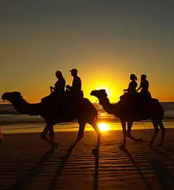 Named for the Java-to-Australia undersea telegraph cable that reaches shore there, Cable Beach is situated 7 km (4.3 mi) from town along a bitumen road. The beach itself is 22.5 km (14.0 mi) long with white sand, washed by tides that can reach over 9 m (30 ft).[5] Located directly east of Cable Beach over the dunes is Minyirr Park, a coastal reserve administered by a collaboration of the Shire of Broome and the Yawuru people.