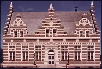 The building features a grand main entrance facing south on Center Street with a Doric pediment, cornice, and squared columns. Additionally, there is a western entrance on Broadway. The structure stands at one and a half stories high, with a steep slate roof adorned with end gables, stepped-up windows, and decorative gables showcasing Renaissance design elements influenced by German Renaissance and Baroque styles.