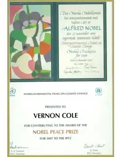 Dr. C. Vernon Cole (November 12, 1922 – August 30, 2013) was a soil scientist known primarily for his work on nutrient cycling in agroecosystems. He was a member of Working Group II of the Intergovernmental Panel on Climate Change (IPCC) Second Assessment report, and the lead author of Chapter 23 “Agricultural Options for Mitigation of Greenhouse Gas Emissions”.[1] The IPCC was awarded the Nobel Peace Prize in 2007.[2]