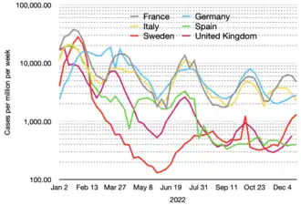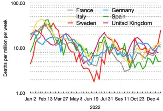 In March 2022, The Lancet published a study comparing excess mortality rates per 100,000 population, in 191 countries in the world, over the first two years of the pandemic (2020 and 2021). The study showed that amongst the major western European countries, those with the highest rates were Italy with 227, Portugal 202, Spain 187, Belgium 147, and the Netherlands 140. The average was 140 and below that were the United Kingdom at 127, France 124, and Germany 121 - the difference between these three was not statistically significant - and that Ireland (13) and the Scandinavian countries had lower rates.[11][12]