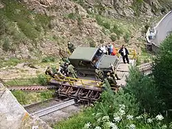 Trwnc incline at the Vivian Quarry[1] showing two permanently attached platform wagons. Slate trucks were pushed onto the horizontal tops of these wagons to travel on the incline.