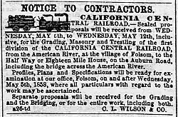 - ^ "CALIFORNIA CENTRAL RAILROAD". cdnc.ucr.edu. Sacramento Daily Union, Volume 16, Number 243. January 20, 1859. Retrieved June 21, 2021.
