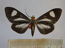 2. ^ Toulgoët, Hervé de & Navatte, Jocelyne (2000). "Calodesma dioptis (Felder, 1874)". Illustrated Catalogue of the Arctiidae Arctiinae and Pericopinae of French Guyana Found in the Collection of the Museum National d'Histoire Naturelle in Paris. Retrieved September 12, 2019.