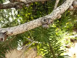 Calothamnus pinifolius is an erect shrub that grows to 0.3–2.0 m (1–7 ft) high with a few long shoots and branches and a short shoot emerging from above the leaves of every long one.[2] Its leaves are about 20–30 mm (0.8–1 in) long, crowded, thin and prickly.[3][4]