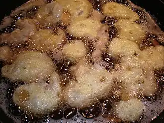 Camaron rebosado is prepared by removing the heads, and sometimes the tails as well, of the shrimp.[5] It is then sliced lengthwise along the back and butterflied, with the vein removed.[6][7] The shrimp is then marinated for a few minutes in a mixture of calamansi juice, salt, black pepper, garlic, and other spices to taste. The batter is made by mixing flour with egg, black pepper, corn starch or baking powder, and water.[7][8][6][4] The shrimp is coated evenly and then fried in hot oil.[7][8] It is also common to coat the shrimp in bread crumbs before frying.[9][10]