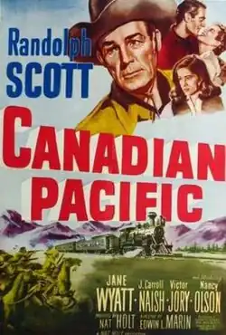 Canadian Pacific is a 1949 American historical Western film, directed by Edwin L. Marin and starring Randolph Scott and Jane Wyatt. Filmed in Cinecolor on location in the Canadian Rockies in Banff National Park, Morley Indian Reserve in Alberta, and Yoho National Park in British Columbia,[1] it is a story about the building of the Canadian Pacific Railway.