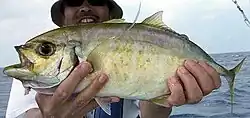 The barcheek trevally (Carangoides plagiotaenia), also known as the barcheek kingfish, shortridge trevally or oblique-banded trevally, is a species of moderately large marine fish of the jack family Carangidae. The barcheek trevally is distributed throughout the tropical waters of the Indo-west Pacific region, ranging from South Africa in the west to Japan, Australia and a number of small central Pacific islands in the east. The species inhabits inshore and offshore waters, found along the slopes of lagoons and out to deeper reefs on the continental shelf, where it preys on small fish and benthic crustaceans. It is a moderately large fish, growing to a maximum recorded length of 50 cm, and can be distinguished from similar species by its somewhat protruding lower jaw and the dark banding on its operculum. It is of minor importance to fisheries throughout its range, taken by trawling, hook and line methods and various inshore fish netting methods.