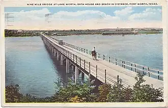 Situated on Lake Worth and the Nine-Mile Bridge, the Fort Worth government built amenities there in 1917. A popular destination in the city, carnival companies were contracted in 1919 to build attractions, and the Fort Worth Auto Bus Company was established to transport visitors to the beach. In summer 1920, it received 6,000 visitors per day, with 150,000 natatorium tickets being sold in the same period. Also in 1920, a gathering spot—called a "casino", despite not containing gambling equipment—and a dance hall were built, but burnt down in 1921.[2]