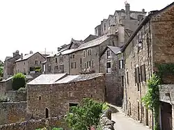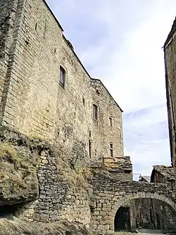A castle was built on this strategic rock in the 8th century. It was rebuilt in the 11th century. The south wall of the keep was the strongest with the principal vaulted rooms and two square corner towers. A grand staircase was placed to the north in the 18th century. A 15th century entrance gate displays the coat-of-arms of the two families. Also at this time two wings were added conserving the appearance of a fortress. The core of the village was protected by defensive walls which are mainly intact. 44°07′47″N 2°55′57″E / 44.12961°N 2.93252°E / 44.12961; 2.93252[5]