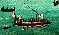 The modern generic designation "Navy of the King of Aragon" is inexact and not very descriptive of medieval reality,[4][5] because until Ferdinand the Catholic, the galleys of the Crown of Aragon were Catalan, Valencian or Majorcan. They were often owned by local institutions (Generalitat, municipalities, etc.). Sometimes they were privately owned, or brought into the service of the king.[6][7] For quite a long time, the fame of the Catalan army was recognized by many writers:
