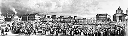 Another artistic depiction of The Cathedral of Our Lady of the "Omen" is the 1839[91] lithograph Removal of the Icon by Bichebois, Adam and Bouchaud, made in Paris from an original by F. A. Junkovsky.[94] One of the copies of this lithograph is kept in the State Russian Museum. The lithograph shows the Red Square of Kursk on the day the Theotokos of Kursk was taken out of the Cathedral of Our Lady of the "Omen" before the beginning of the procession to the Kursk Root Monastery Hermitage of the Nativity of the Virgin Mary. The cathedral is in the right side of the picture, and it looks wrong. It has one bell tower with close columns, but it should have two. Each bell tower had wide openings for ringing the bells.[95][96]