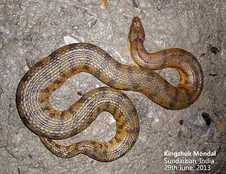 It is commonly found in mangroves, mudflats, streams, ponds, tidal pools, on algae patches, and has even been found burrowing into the mud. It is rear-fanged and is mildly venomous. An aquatic and nocturnal snake, it feeds mainly on fish and is known to consume eels.