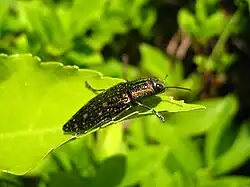 The larvae are ideally adapted to woodboring, being dorsally flattened with a broad thorax. Females lay approximately 75 eggs in the crevices of bark or on wounded trees and sometimes in the exposed beams of older houses where they become serious pests. The larvae tunnel under the tree bark where they vigorously feed on wood. The larval stage of this insect may last for many years. Occasionally males are selectively killed at the embryo stage by bacteria known as Wolbachia. This can result in a limited number of males in the population. Females lacking a male can then reproduce using an asexual form of reproduction known as parthenogenesis.[1]