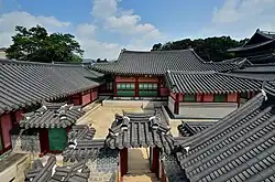 After this reconstruction and without rivalry from Gyeongbokgung, Changdeokgung became the definitive main palace of Joseon. More buildings continued to be constructed in the palace. There was a fire in the palace in 1671.[28] Under the reign of King Sukjong (r. 1674–1720), the rear garden reached its greatest extent.[29] In 1687, a fire destroyed almost all of the Mansujeon area. In 1702, a fire destroyed part of the East Palace.[30] Succeeding kings continued to expand and renovate the palace, although King Yeongjo (r. 1724–1776) ordered much fewer repairs as he primarily resided in Gyeonghuigung.[29] There were a number of fires during the reign of King Sunjo (r. 1800–1834),[31] with a major one occurring in the 10th month of 1833.[30] During his reign, most construction at the palace was either rebuilding or maintenance work.[31] By the 19th century, Changdeokgung and Changgyeonggung were functionally a single palace. The two had some unique government offices, although they had some facilities with overlapping purposes.[32]