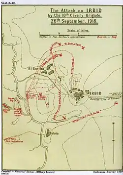 The 4th Cavalry Division at Jisr el Mejamie and Beisan was ordered to march east to intercept this remnant of the Fourth Army. At Irbid the 2nd Lancers charged Ottoman rearguard units but were strongly counter-attacked and defeated. By the next morning the Ottoman force had withdrawn from the town.
